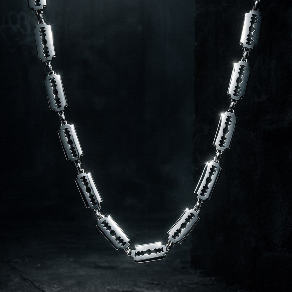 Engineered in tarnish resistant stainless steel, this chain is made for daily wear and built to endure. Durable, bold, and designed for the underground, the Razor Blade Chain is more than jewelry. It is armor for those who cut against the grain.